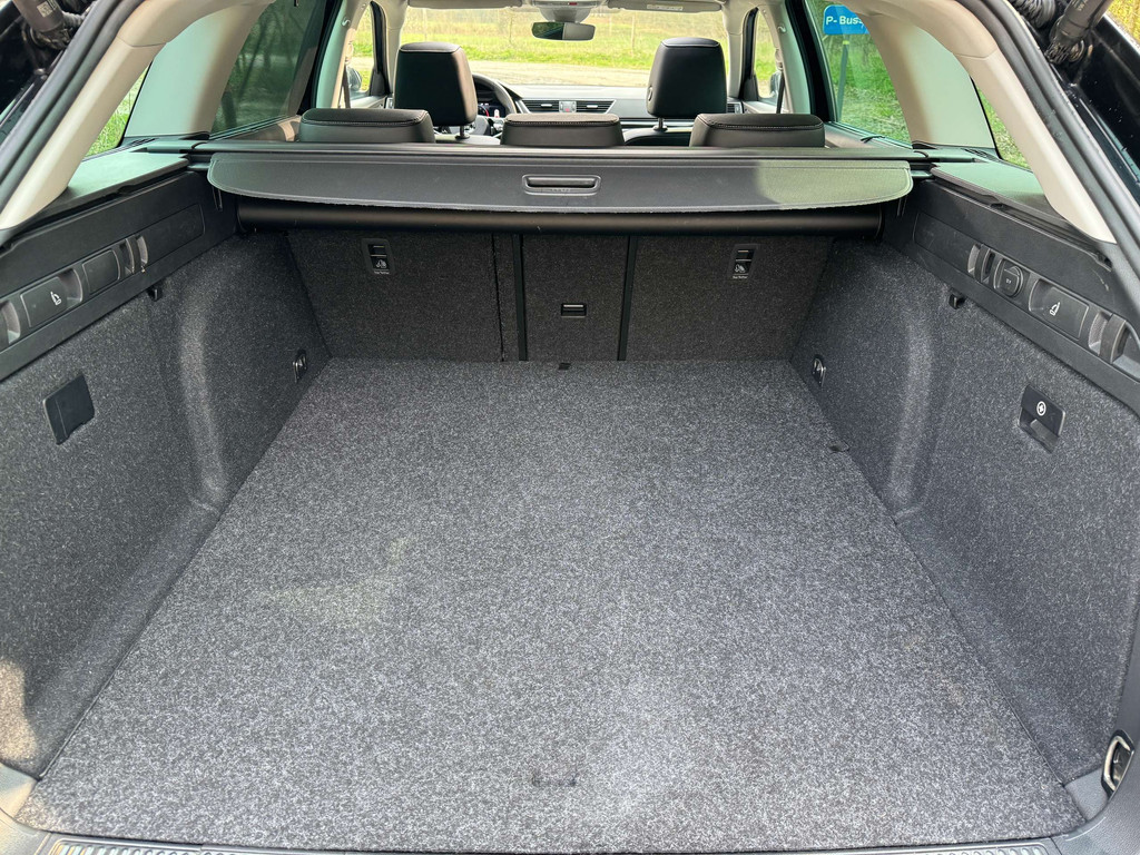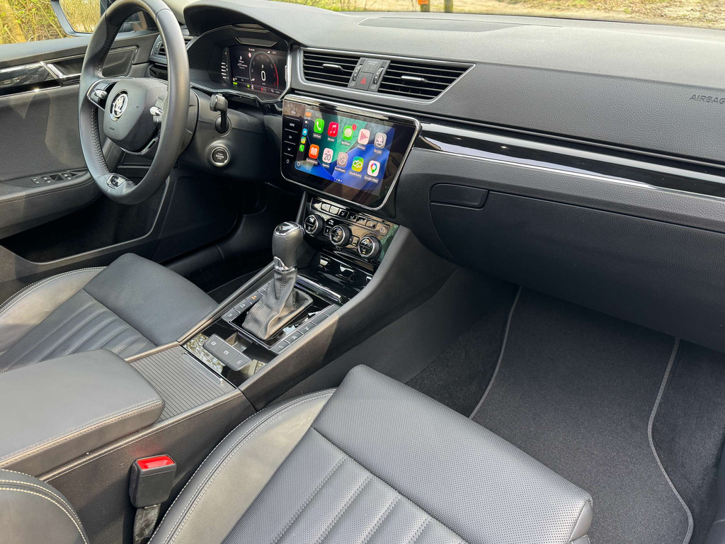 Skoda Superb Combi L&K (topversie) PHEV – Elektrisch/Benzine, automaat. Jonge hybride stationwagen met slechts 44.000 km, volledig uitgerust met panoramadak, trekhaak en uitgebreide assistentiesystemen. Luxe interieur met leren bekleding en massagefunctie.